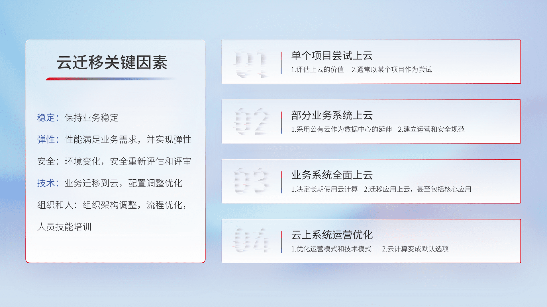 结合实际业务,,,,从规划设计、、、云平台选型、、、、云原生改造、、、数据迁移、、集成交付,,,迁移全过程为客户识别最佳上云路径,,,,做好风险识别管理,,,设计网络架构、、身份权限、、、、安全审计合规、、操作审计、、日志审计、、监控告警策略、、、多站点容灾设计等,,,,对云上基础设施进行整体规划,,,,提升IT治理水平,,,以满足弹性、、、、高可用、、高性能的需求。。。。