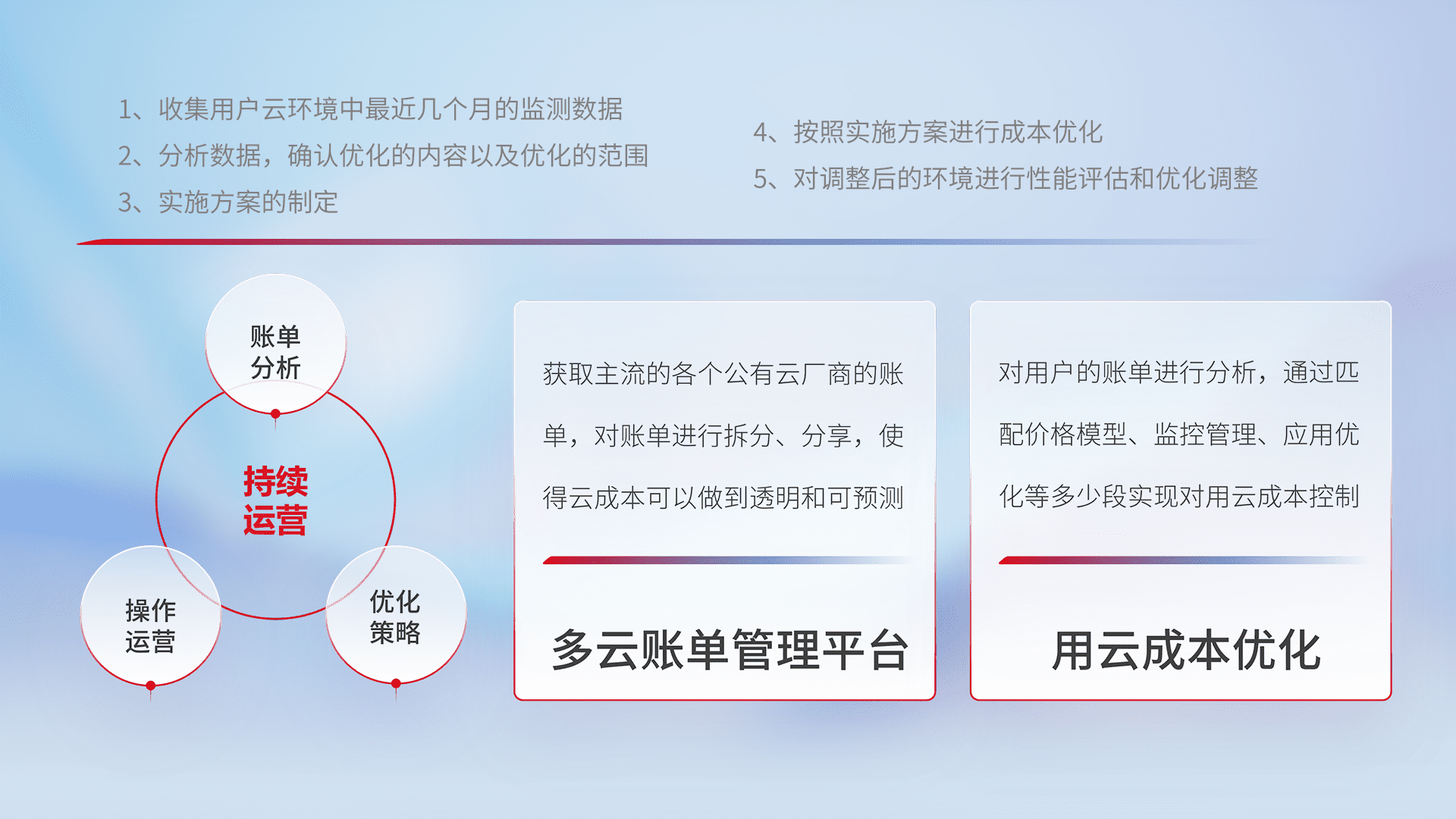 通过多云纳管,,以统一的资源数据模型把客户的云资源进行抽象和封装,,进而实现对多云资源的统一操作,,,,保障云资源管理的可靠性、、、、稳定性与可用性。。。量身定制化运维内容,,,配置、、、开发运维、、、补丁管理、、备份、、、监控、、、、认证和访问管理、、、、审计和日常巡检等,,,保障在用云过程中的可靠度,,,稳定度以及高可用率。。。。