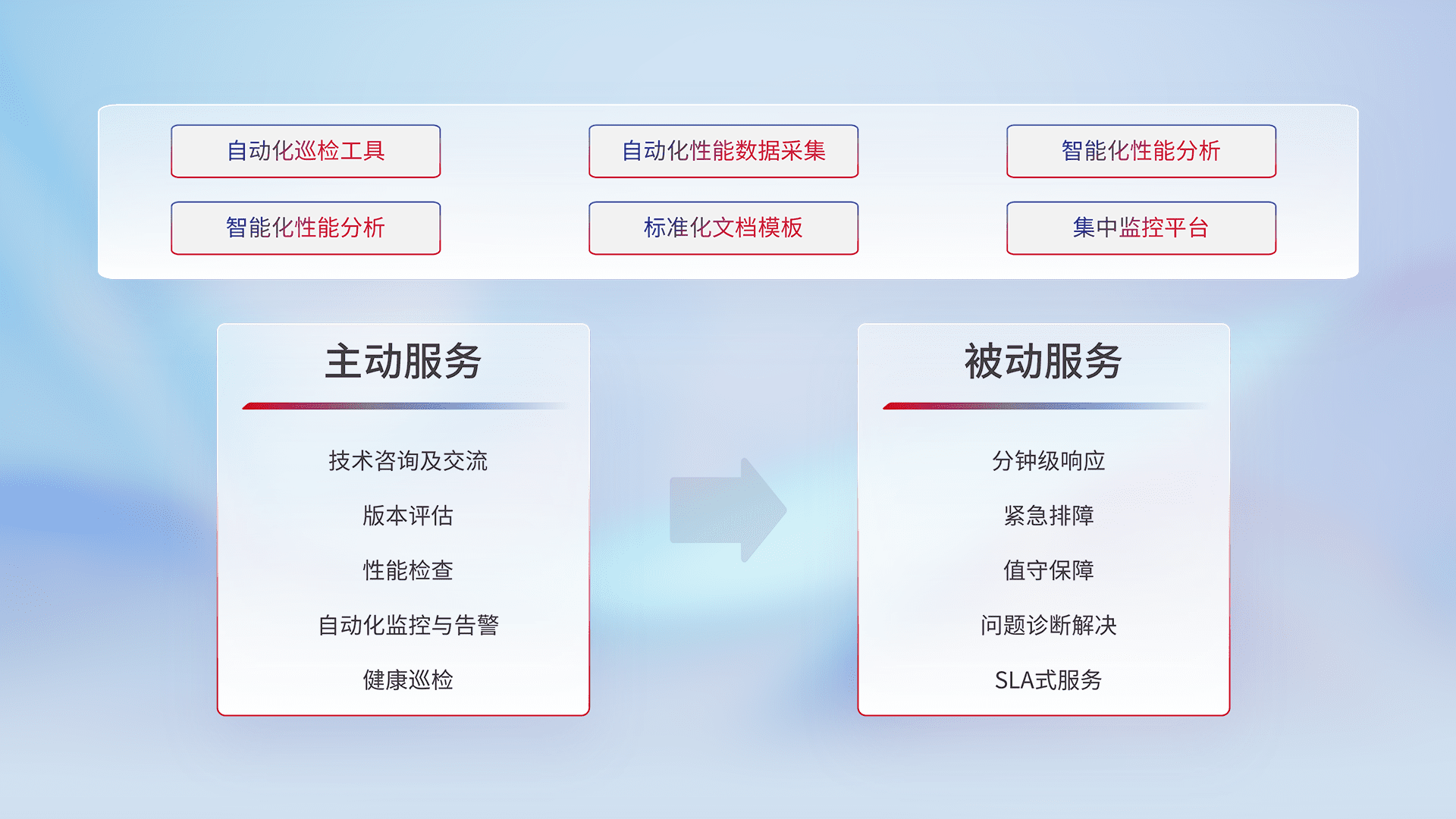 智能化工具和标准化文档,,,,保障服务质量,,,,提供主动服务(包含技术咨询、、、版本评估、、、性能检查、、自动化监控与告警、、健康巡检)和被动服务包含(分钟级响应、、、紧急排障、、值守保障、、、问题诊断解决、、、SLA服务)。。。