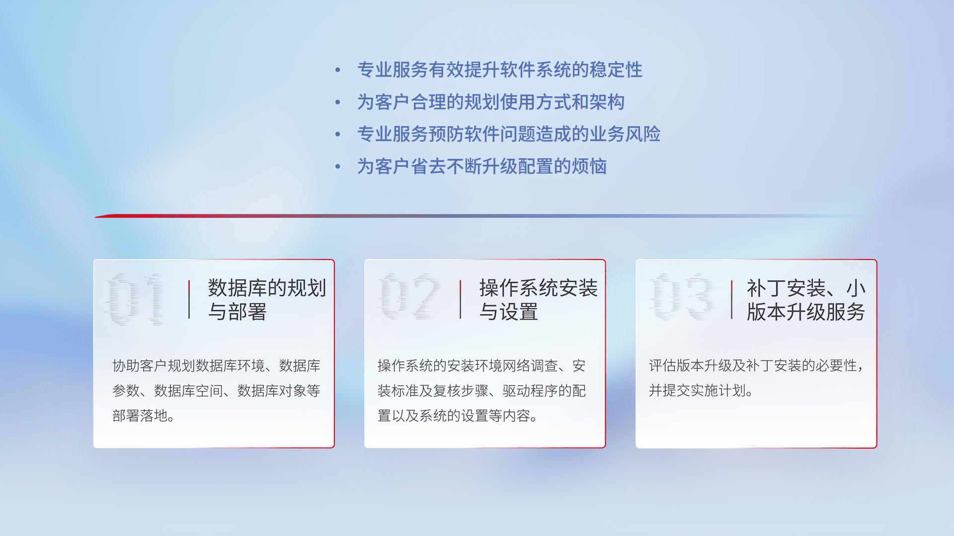 为客户提供软件规模升级、、、快速部署、、、按需配置的专业服务,,,,从数据库的规划与部署到操作系统的安装与设置,,再到补丁安装和小版本升级提供支持。。。。